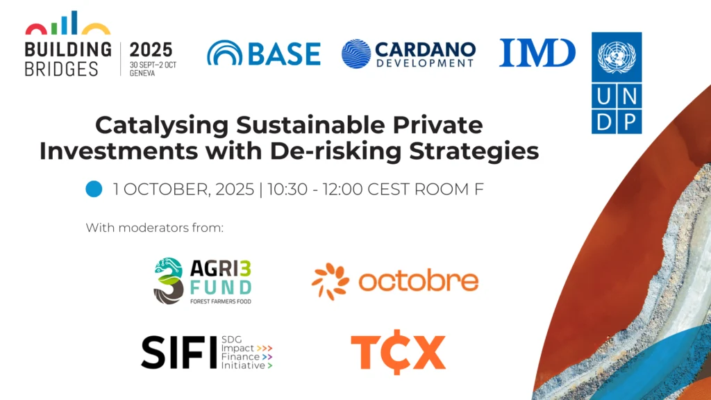 Developing countries face a daunting financial shortfall of USD 2 to 4 trillion annually to meet the challenge of climate change. Despite the urgent need, private capital often stalls at the threshold, deterred by perceived risks and weak guarantees. At Building Bridges 2025, BASE, Cardano Development, the UNDP Rome Centre for Climate Action and Energy Transition and the IMD Business School are co-hosting a session dedicated to exploring how de-risking strategies can unlock private investment for sustainable projects.