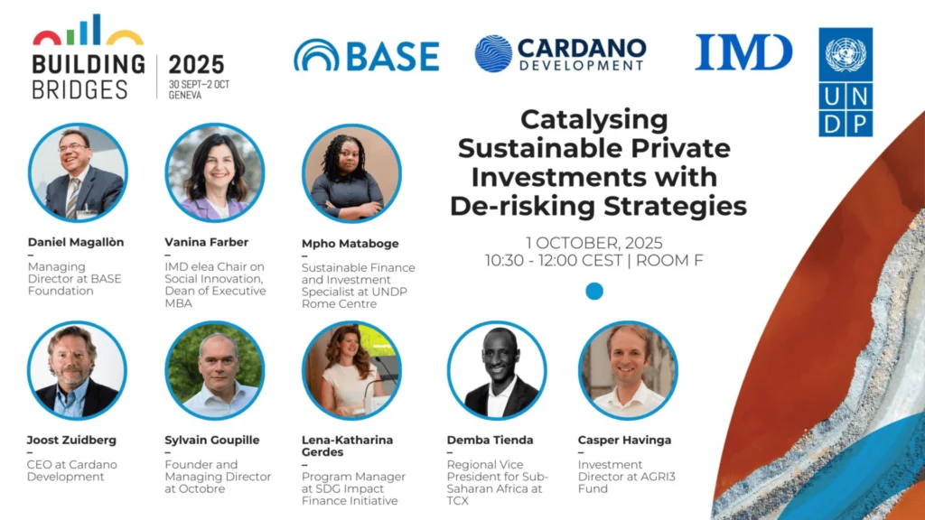 Against this backdrop, BASE, together with Cardano Development, the UNDP Rome Centre for Climate Action and Energy Transition, and IMD Business School, convened a dedicated session at Building Bridges 2025, titled Catalysing Sustainable Private Investments with De-risking Strategies to explore how de-risking strategies can unlock private investment for sustainable projects in emerging markets and developing economies. The session brought together around 100 practitioners from development finance institutions, donors, banks, insurers, fund managers, corporates, and project developers working across energy, agriculture, and nature-based sectors.